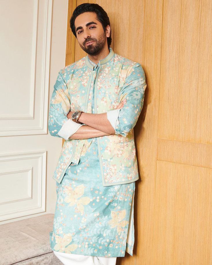 He is wearing a light blue and pastel yellow floral printed kurta-pyjama set layered with...