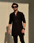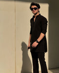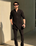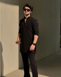 BLACK Color Men's Kurta Pajama Set in Soft Silk With EMBROIDERE Work on Neck