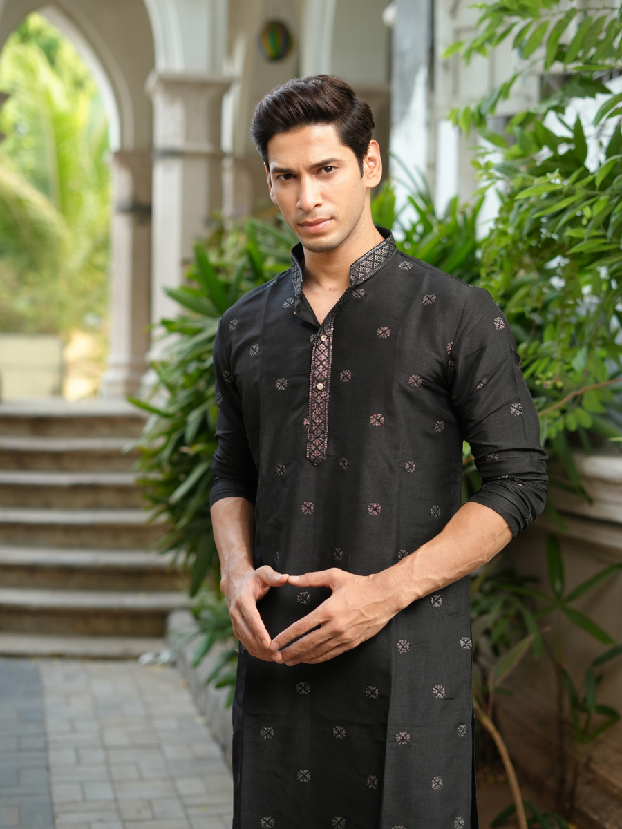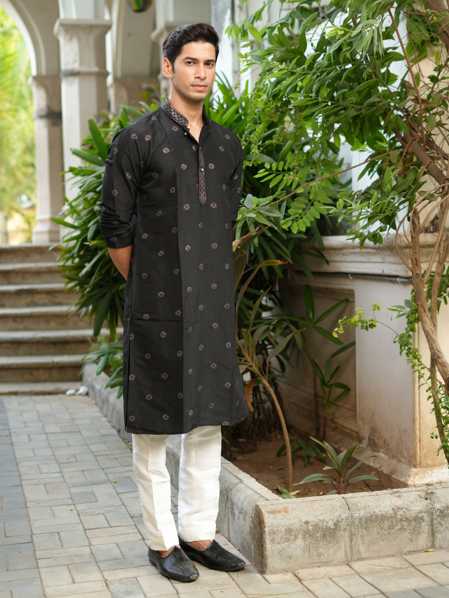 This BLACK EMBROIDERY WORKED MEN'S KURTA Is Created by KURTA ZONE This Hand-stitched Kurta Is Made of 100% COTTON Fabric With Having Embroidery work Over It. Our Attractive Prints Add More Charm to Your Look, Wear This at Any Time Because the Fabric Is So Smooth to Skin That You Will Love It.