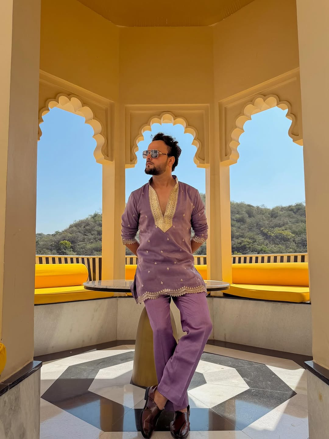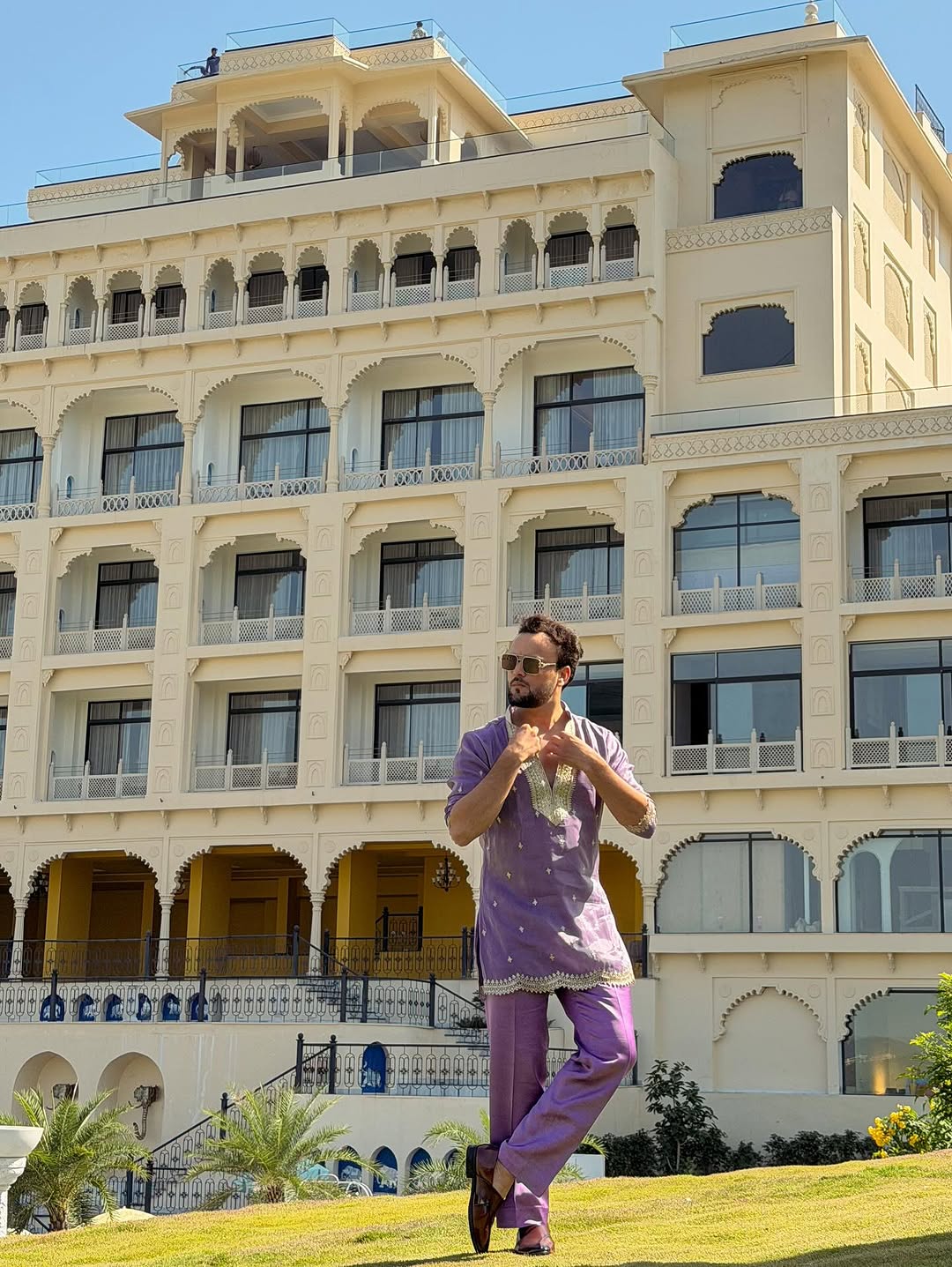 Styling: The look is completed with brown leather loafers/slip-ons (Juttis or Mojaris are also common but these look like Western loafers) and dark sunglasses, giving it an Indo- Western or contemporary royal feel suitable for a destination wedding or festive event.