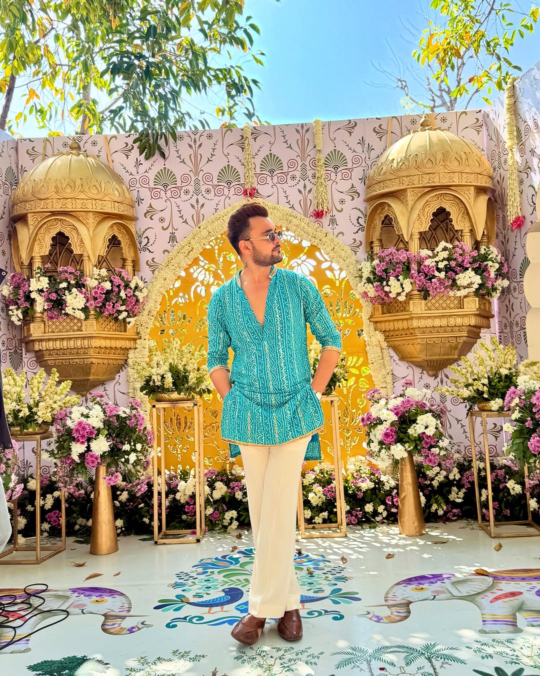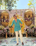 This bandhani Printed Kurta Pattern For Men in indigo blue and off-white creates an enchanting look for festive occasions. Crafted from Cotton Poly Blend fabric, the kurta ensures breathability and strength. This Men's Designer Kurta comes with buttons for closure, a collar stand, and loose sleeves. Wear a Mojri and a pajama to Complete the look.