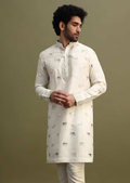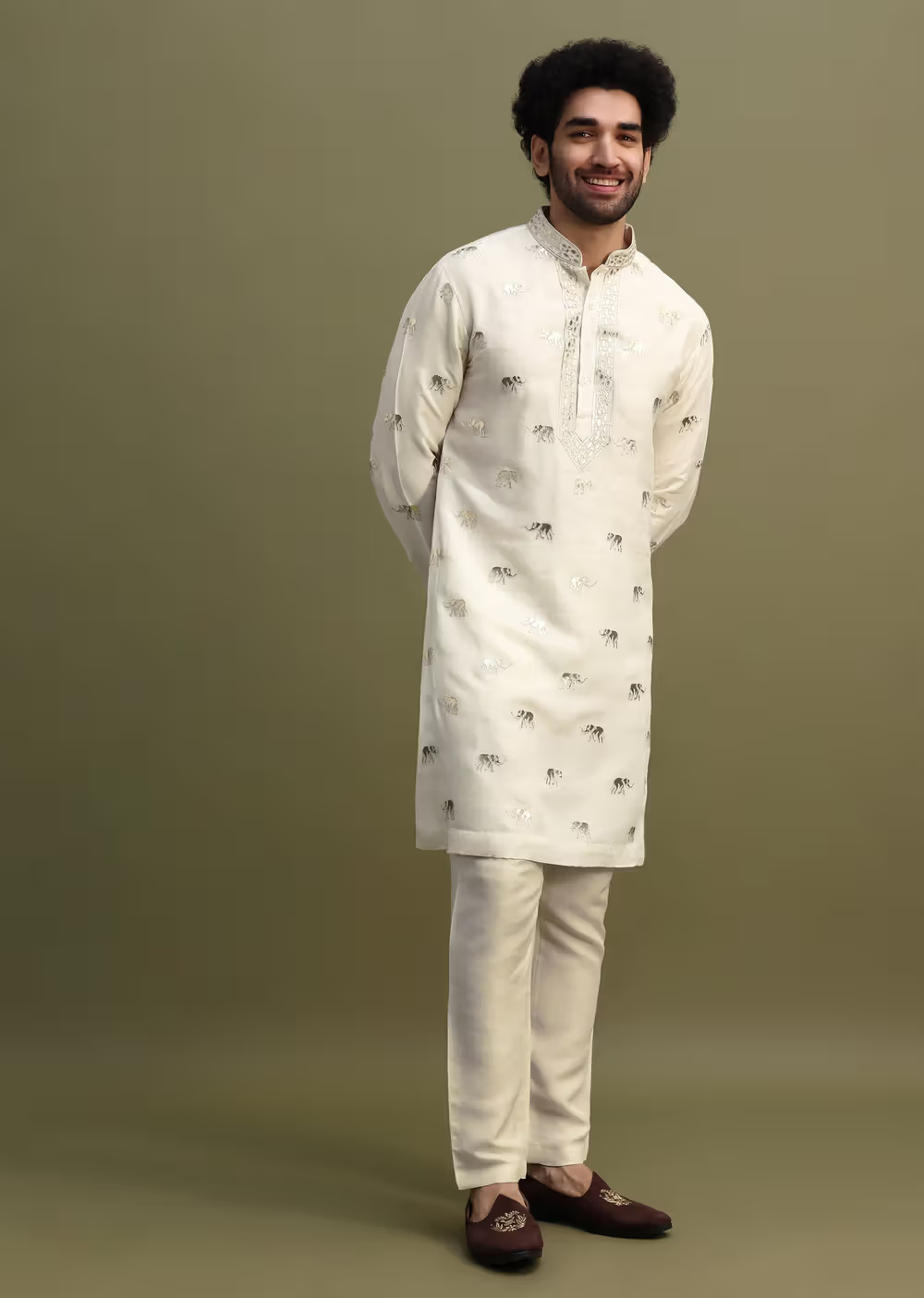 White FOIL EMBROIDERY WORK KURTA PAJAMA SET FOR MEN'S