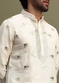Brighten up any occasion with this striking yellow kurta, adorned with intricate leatherite embroidery featuring subtle elephant motifs. Paired with classic ivory trousers, this ensemble effortlessly blends tradition with modern design. Perfect for festive celebrations or special events, the rich detailing and vibrant hue make this kurta stand out while maintaining a sense of refined elegance.