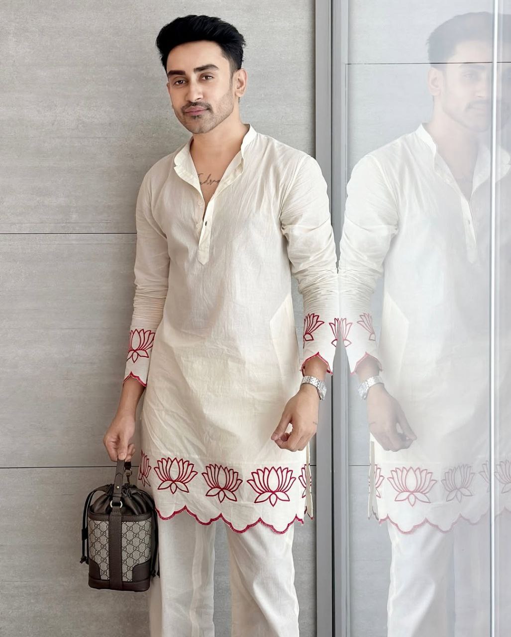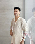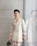 White Lotus Embroidered Men's Kurta With Pajama This Digital printed Kurta Is Made of 100% Pure Cotton Fabric With Having Hand digital Printed Prints Over It. Our Attractive Prints Add More Charm to Your Look, Wear This at Any Time Because the Fabric Is So Smooth to Skin That You Will Love It.
