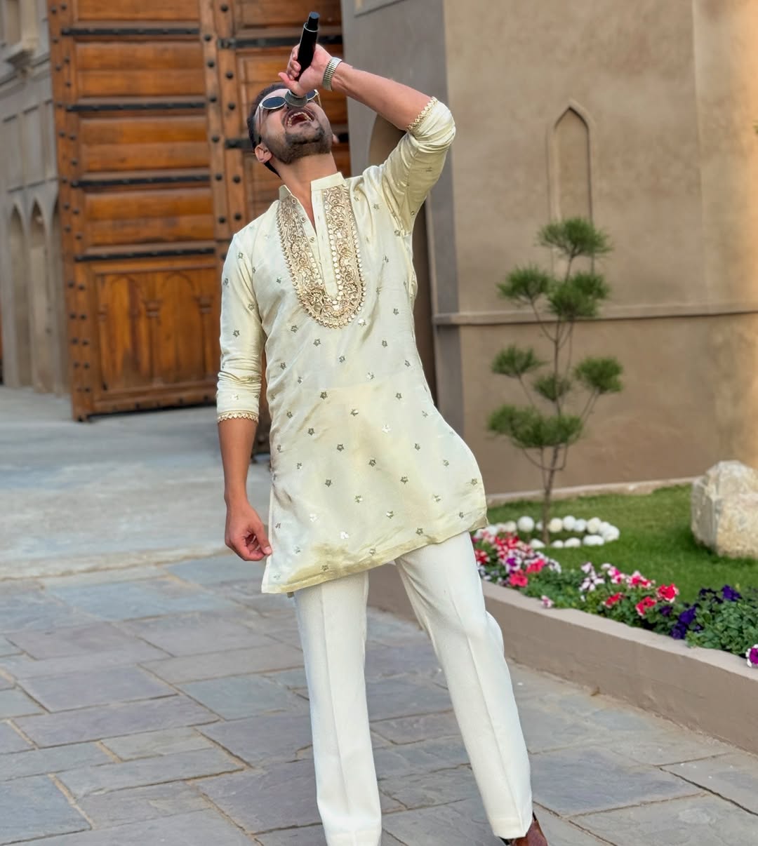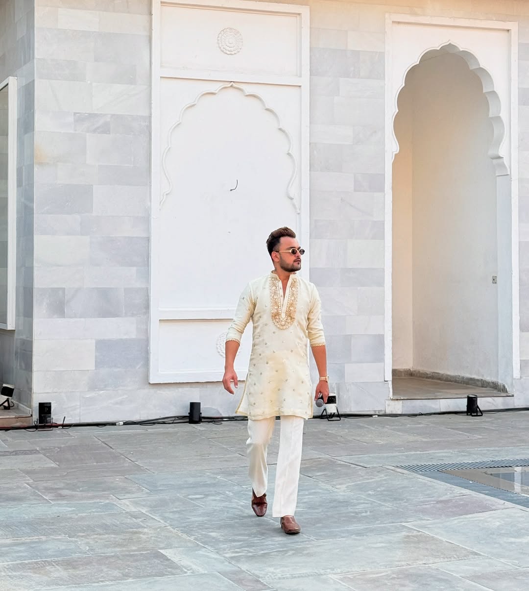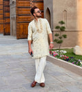 WHITE NECK AND BUTTI EMBROIDERED WORK MEN'S KURTA WITH PAJAMA SET