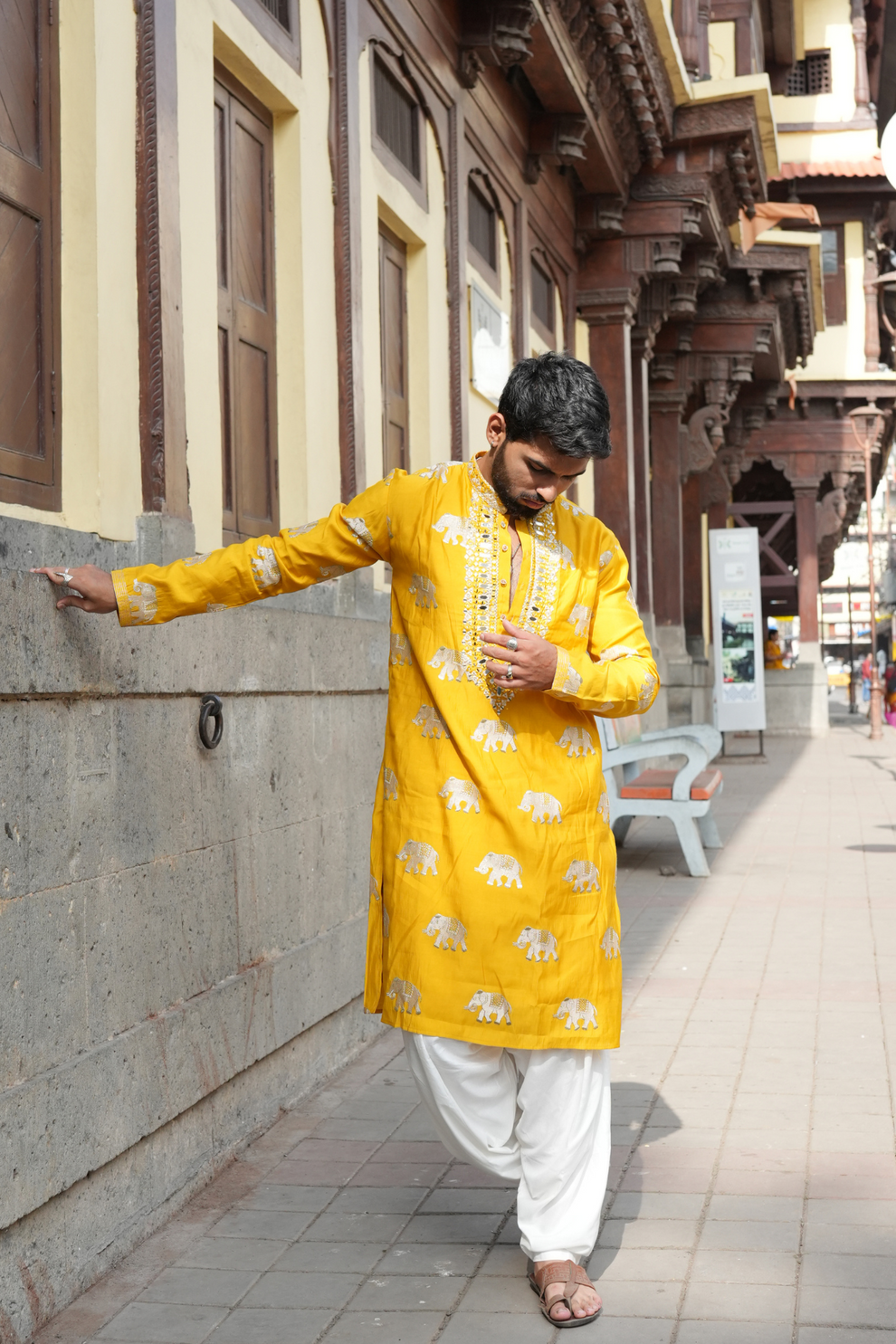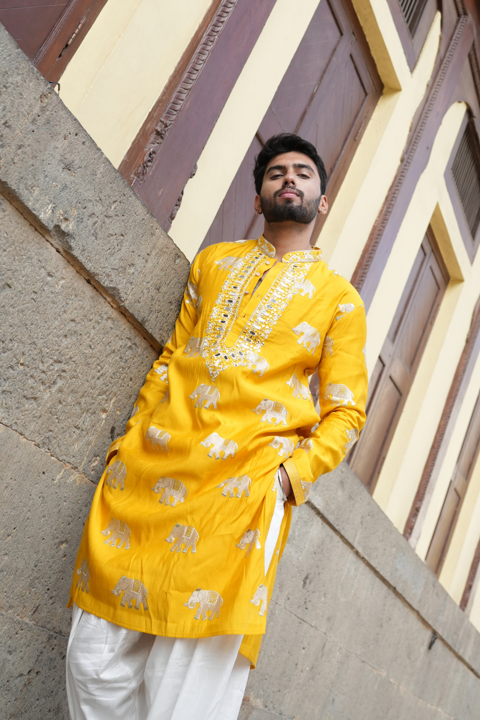 This YELLOW ELEPHANT NECK EMBROIDERED WORK KURTA PAUJAMA SET FOR MEN'S Is Created by MARK KURTA L ,This Hand-stitched Kurta Is Made of 100% Pure Cotton Fabric With Having embroidered work Over It. Our Attractive embroidery Add More Charm to Your Look, Wear This at Any Time Because the Fabric Is So Smooth to Skin That You Will Love It.