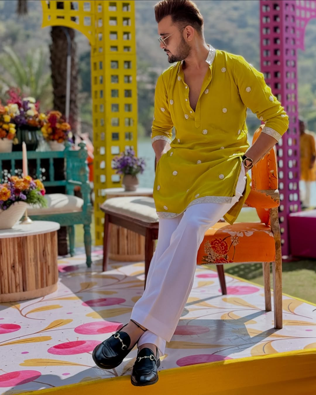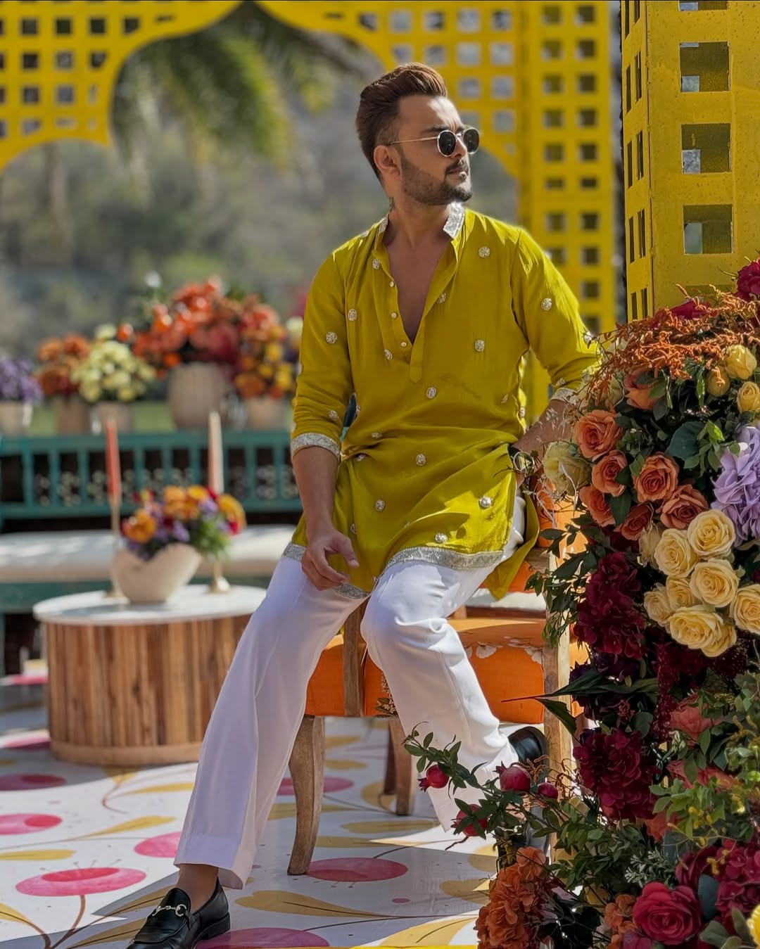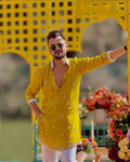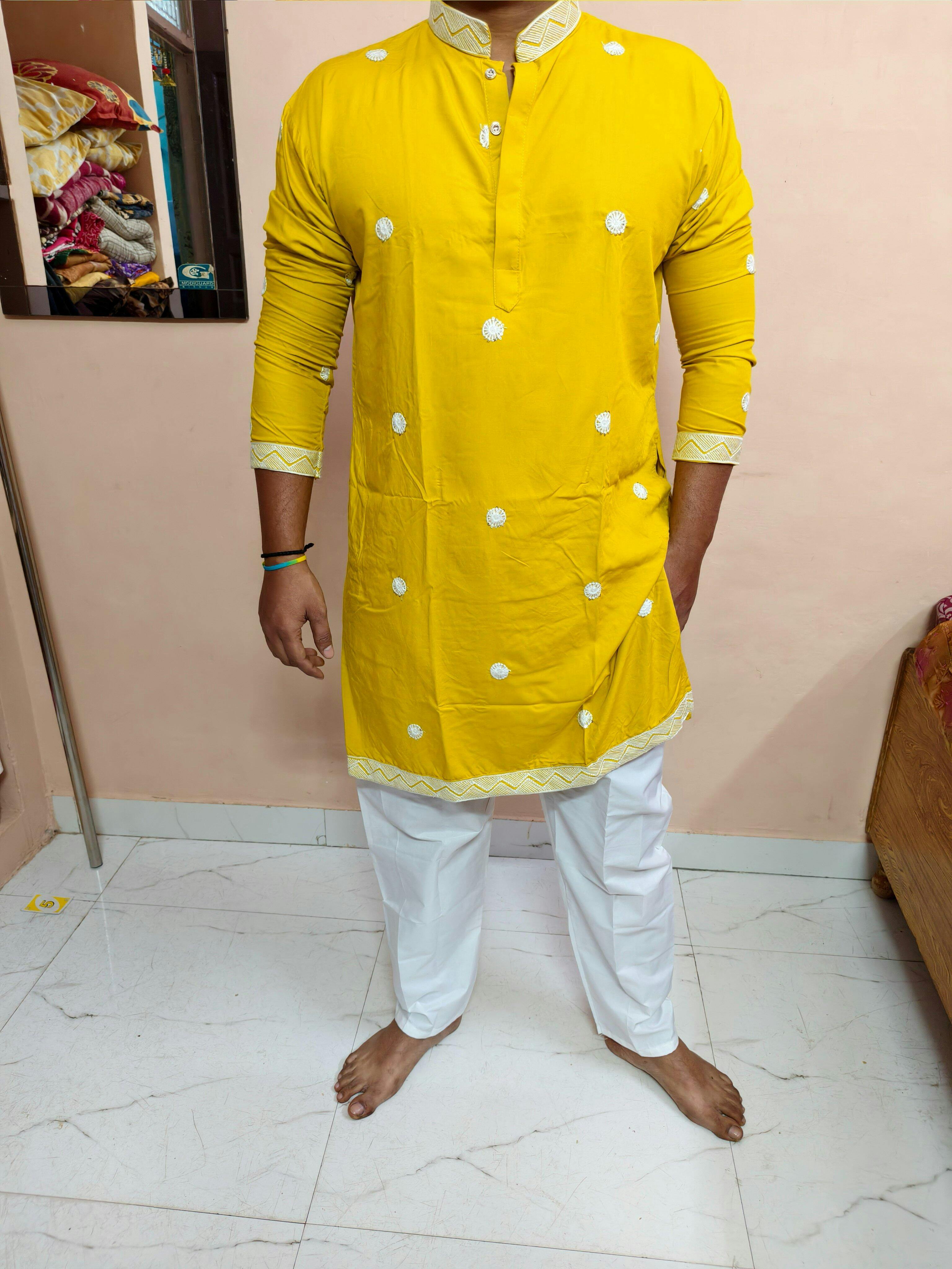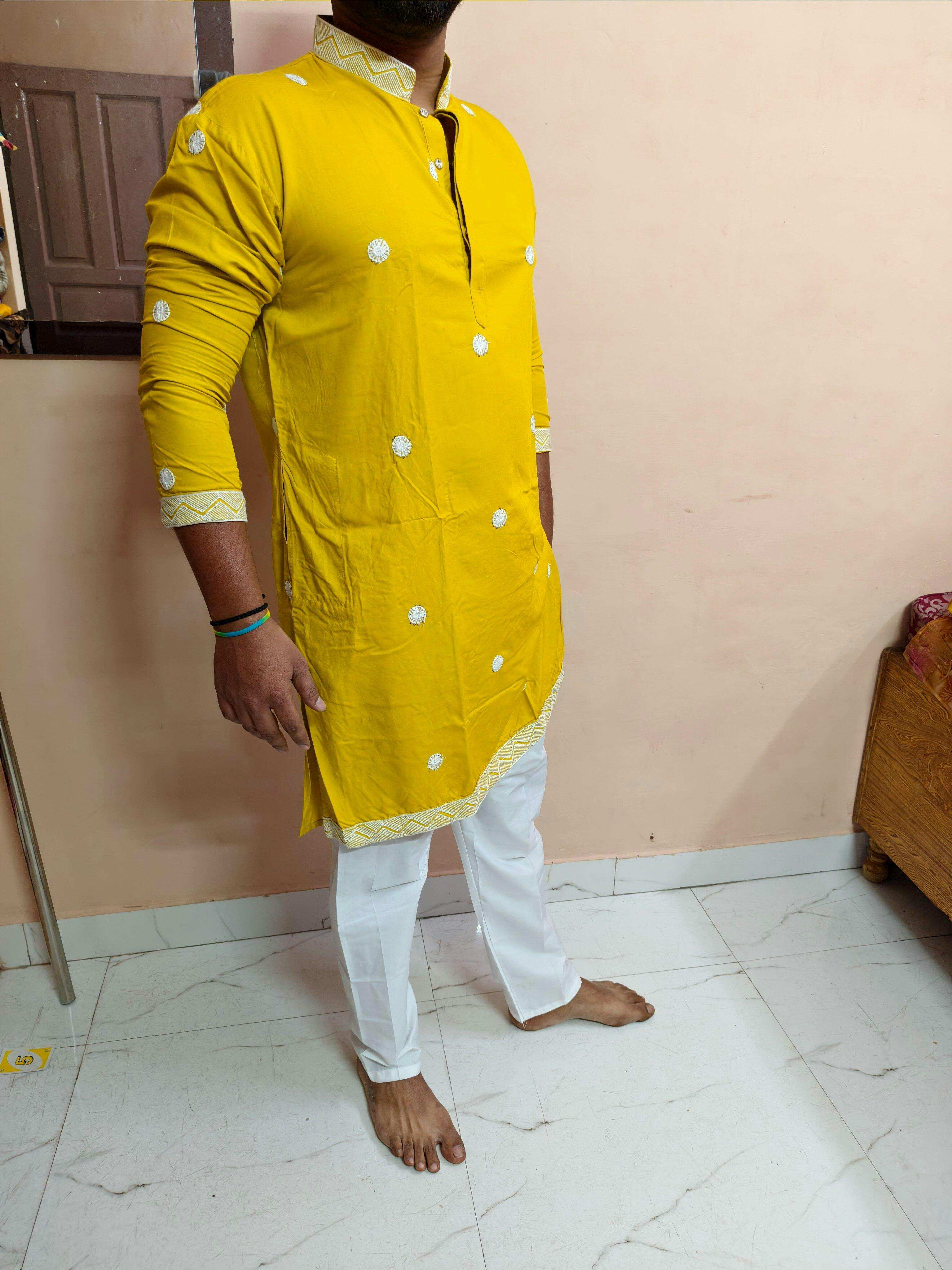 This YELLOW SEQUIN Embroidered Work Men's Kurta with Pajama Is Created by MARK KURTA I ,This Hand-stitched Kurta Is Made of 100% Pure Cotton Fabric With Having embroidered work Over It. Our Attractive embroidery Add More Charm to Your Look, Wear This at Any Time Because the Fabric Is So Smooth to Skin That You Will Love It.